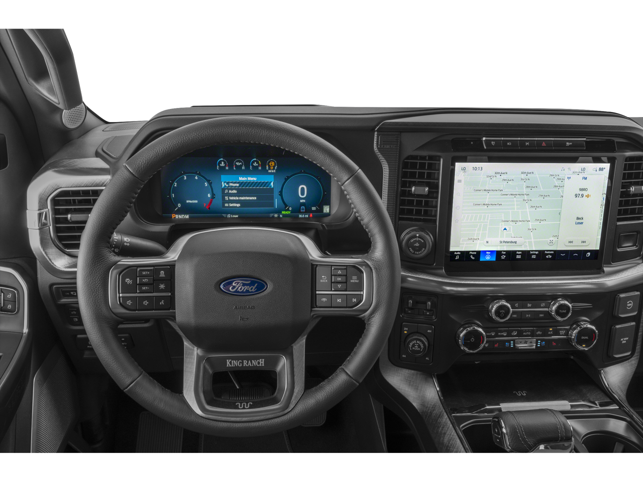 14 Speakers, 19 Alloy wheels, 20 Chrome-Like Wheels, 4-Wheel Disc Brakes, ABS brakes, Adjustable pedals, Air Conditioning, AM/FM radio: SiriusXM with 360L, Auto High-beam Headlights, Auto tilt-away steering wheel, Auto-dimming door mirrors, Auto-dimming Rear-View mirror, Automatic temperature control, Brake assist, Chrome wheels, Compass, Delay-off headlights, Driver door bin, Driver vanity mirror, Dual front impact airbags, Dual front side impact airbags, Electronic Stability Control, Emergency communication system: SYNC 4 911 Assist, Equipment Group 601A High, Front anti-roll bar, Front Bucket Seats, Front Center Armrest, Front dual zone A/C, Front fog lights, Front reading lights, Front wheel independent suspension, Fully automatic headlights, Garage door transmitter, Genuine wood dashboard insert, Heads-Up Display, Heated door mirrors, Heated front seats, Heated rear seats, Heated steering wheel, Illuminated entry, Internet access capable: FordPass Connect 5G, King Ranch Multicontour Leather Bucket Seats, Leather steering wheel, Low tire pressure warning, Memory seat, Navigation system: Connected Navigation, Occupant sensing airbag, Outside temperature display, Overhead airbag, Overhead console, Panic alarm, Passenger door bin, Passenger vanity mirror, Pedal memory, Power door mirrors, Power driver seat, Power moonroof, Power passenger seat, Power steering, Power windows, Radio data system, Radio: B&O Unleashed Sound System by Bang & Olufsen, Rain sensing wipers, Rear reading lights, Rear seat center armrest, Rear step bumper, Rear window defroster, Remote keyless entry, Security system, Speed control, Split folding rear seat, Steering wheel memory, Steering wheel mounted audio controls, SYNC 4 w/Enhanced Voice Recognition, Tachometer, Telescoping steering wheel, Tilt steering wheel, Traction control, Trip computer, Turn signal indicator mirrors, Variably intermittent wipers, Ventilated front seats, Voltmeter.